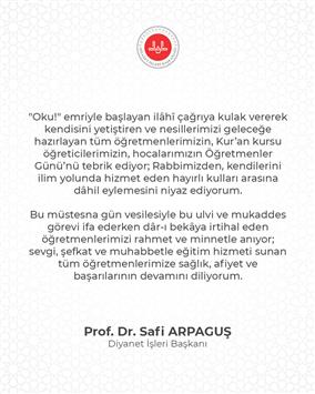 Diyanet İşleri Başkanı Prof. Dr. Safi Arpaguş 24 Kasım Öğretmenler Günü dolayısıyla bir mesaj yayınladı.