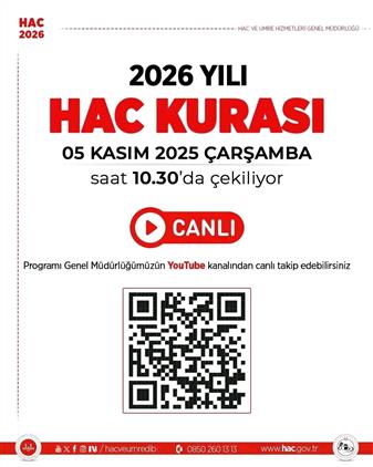 2026 Yılı hac kurasını 05 Kasım 2025 tarihi Çarşamba günü (Yarın) Saat 10:30 itibariyle